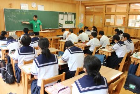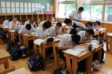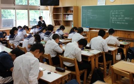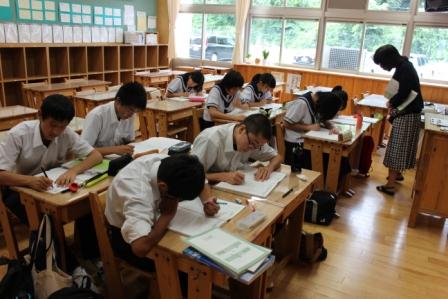 進学を控えた中学3年生に対して夏期講習を行うことにより、進路実現に向けた学力の向上を目指す、「平成29年度サマー・ショートプログラム」が昨日8月1日(火)から8日間の日程で始まりました。今年は、塾の講師2名とサポートティーチャー2名、町内出身の大学生5名が講師です。本校3年生71名が4つのクラスに分かれて、塾講師による一斉指導とサポートティーチャーと大学生による個別指導で、数学と英語の力を伸ばします。
