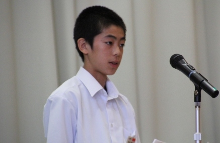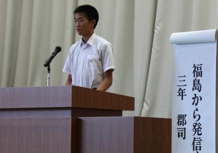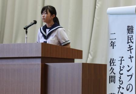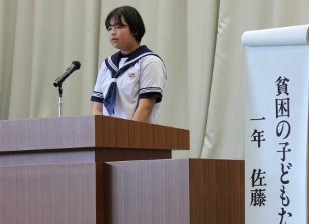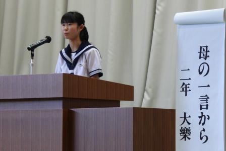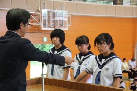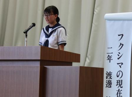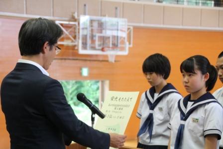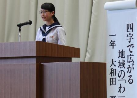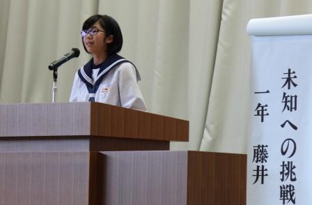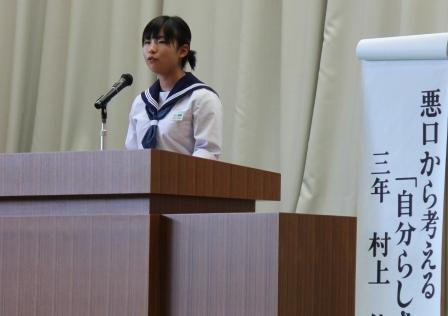 【生徒発表 左:1年 矢吹さん 中:2年 草野さん 右:3年 西牧さん】