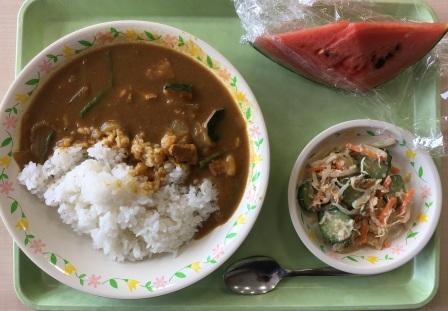 いつもおいしい給食をいただいています。今日の献立は、主食:夏の味覚カレー、副菜:バンバンジーサラダ、デザート:すいか、牛乳です。今が旬の夏の食材をたっぷり使った献立で、5種類です。写真だけではわかりづらいと思いますが、カレーには、「かぼちゃ」「いんげん」「トマト」、サラダには「きゅうり」、そして「すいか」の5種類です。夏野菜や夏の果物には、夏に欠かせない、ビタミンやミネラル、水分が多く含まれているのが特徴で、体のむくみを取ってくれる働きもあります。夏の暑さに負けないように、お家でも夏の食材を食べるようにしたいですね。小野町給食センターの皆様、いつもおいしい給食、ありがとうございます。ごちそうさまでした。