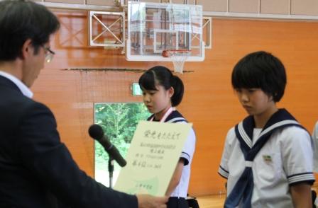 7月22日(土)、喜多方市押切川公園体育館において、剣道競技が行われ、女子個人戦に3年生の荻野さんが出場しました。1回戦は原町一中の選手との戦い。延長戦の末惜敗。面が決まったかに見えましたが、相手も面、旗は1-2。残念。田村、県中と延長戦を勝ち抜いて粘り強さを発揮しての県大会でしたが、ちょっとの差でした。3年間よく頑張りました。お疲れ様でした。1.2年生も応援ありがとう。