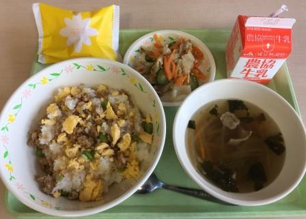 7月20日(木)が1学期最後の給食でした。献立は、主食:そぼろ丼、副菜:ゴマドレッシングサラダ、汁物:沢煮椀、デザート:シューアイス、牛乳でした。