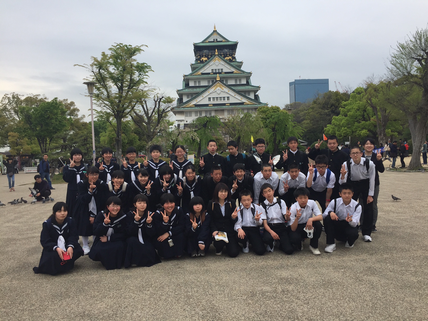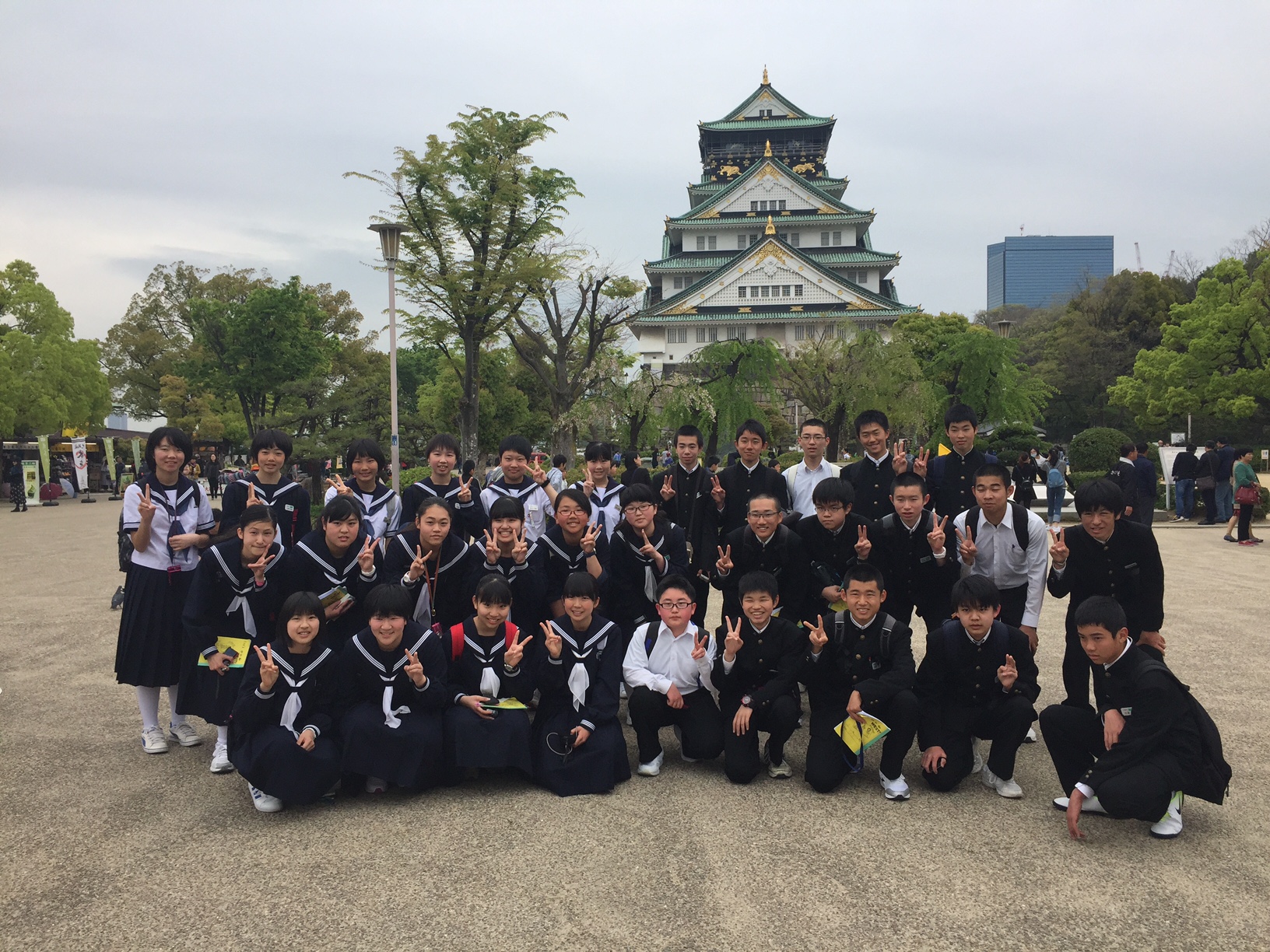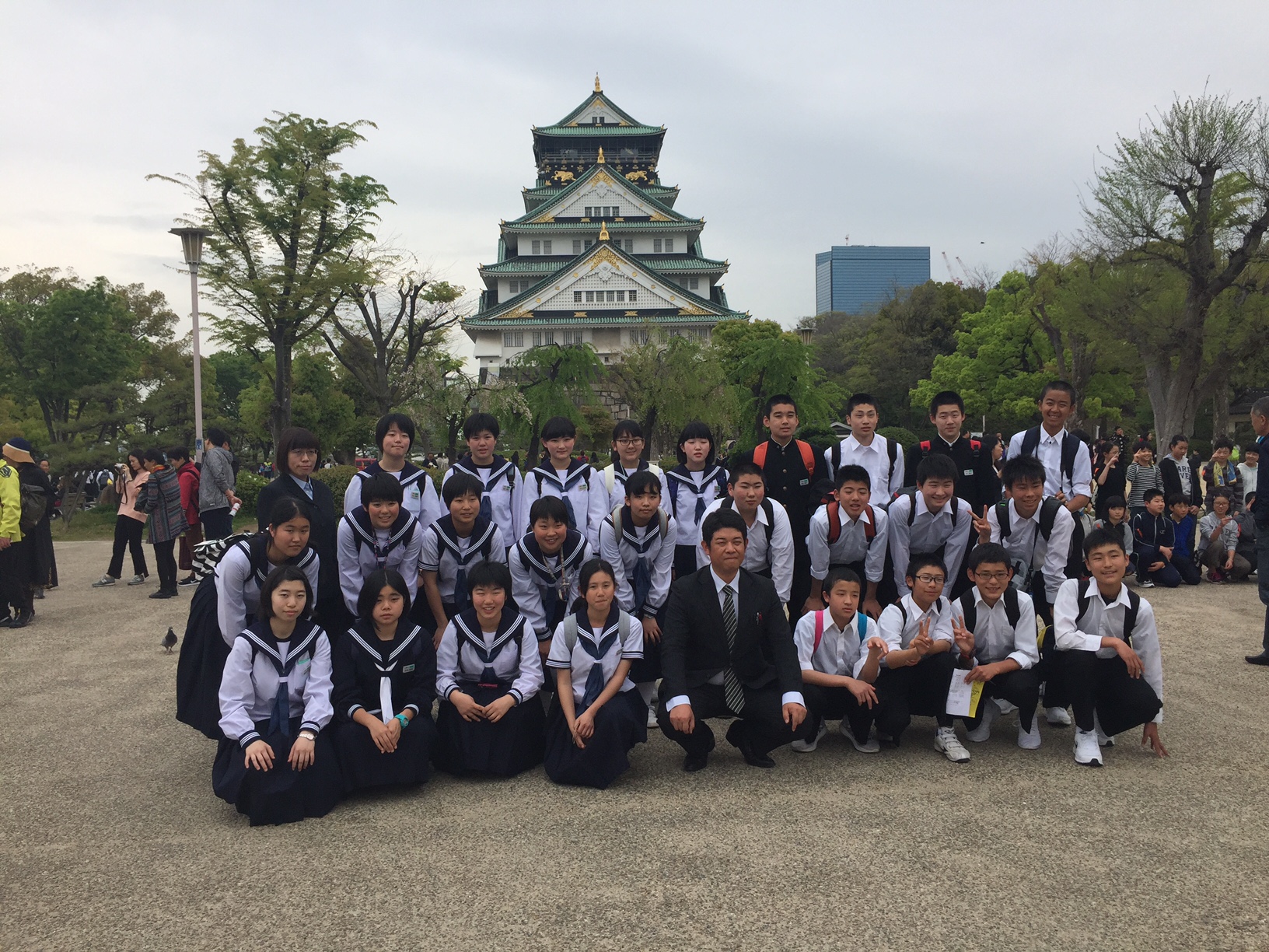 大阪城をバックに。 曇っていますが、雨はなんとか降らずに済みそうです。 1組の集合写真です。IMG_0518.JPG