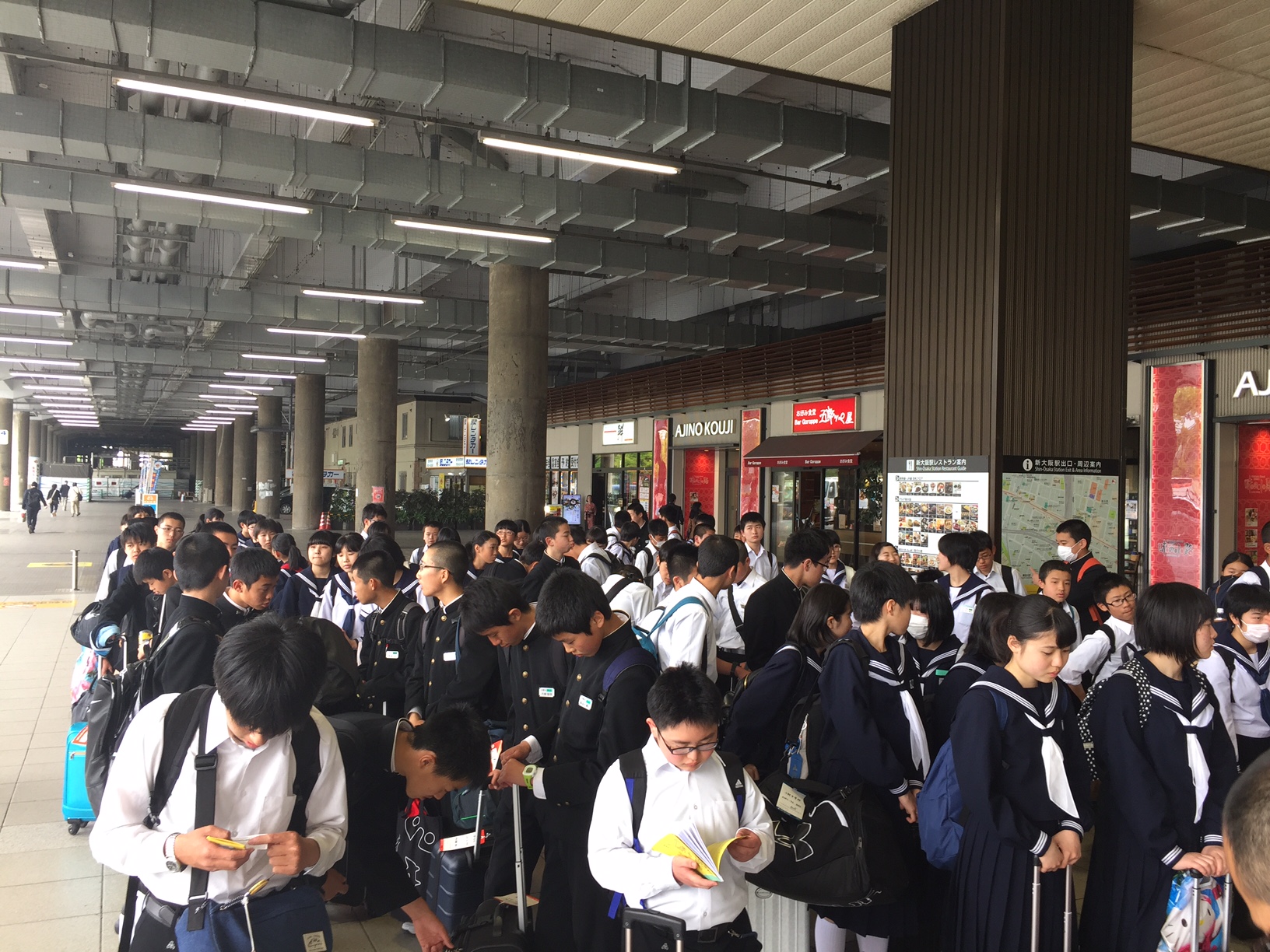 IMG_0522.JPG IMG_0521.JPG 二泊三日の修学旅行も大阪城を最後に見学を終了し、新大阪駅へ到着しました。 東京行きの新幹線に乗車し、11時50分に発車です。 何だか寂しい気がしますが、この修学旅行も新幹線、バスを乗り継いで学校を目指すのみの行程になりました。 全員元気に学校へ戻りたいと思います。