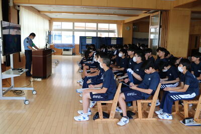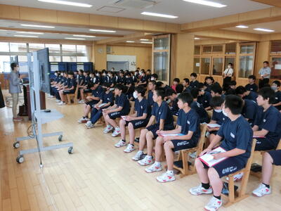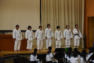 県中地区中体連大会を勝ち上がって7月22日(月)から行われる県大会に出場するたソフトボール部、卓球部、剣道部、柔道部の選手と、7月14日(日)の県吹奏楽コンクール県南支部大会を皮切りに各種大会が始まる吹奏楽部の皆さんを、全校生で激励しました。