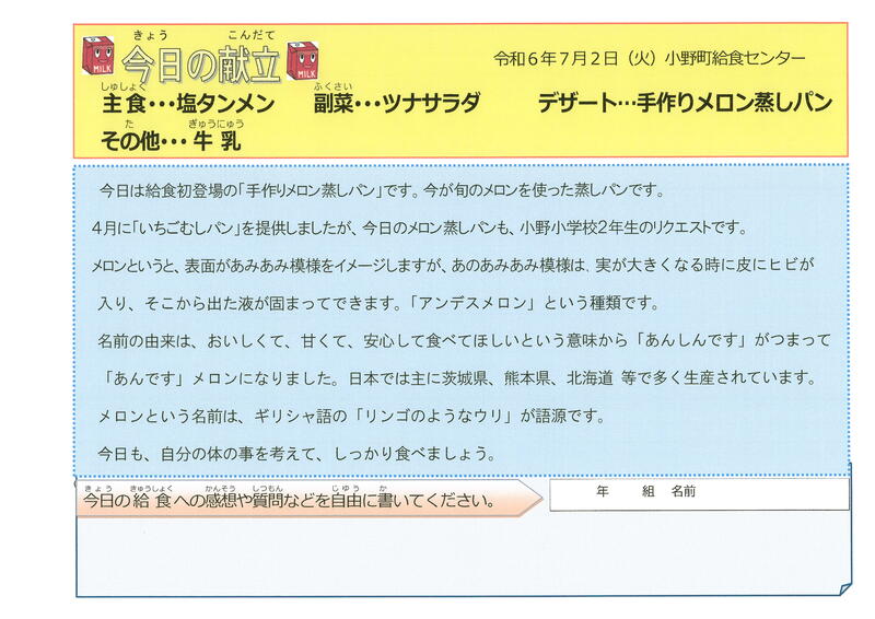小野小の2年生のリクエストで、今回メロン蒸しパンが出ることになりました。