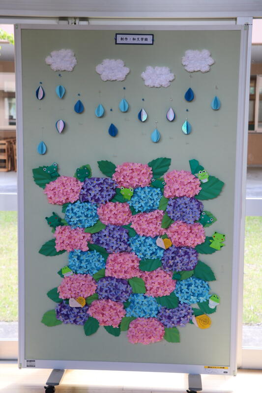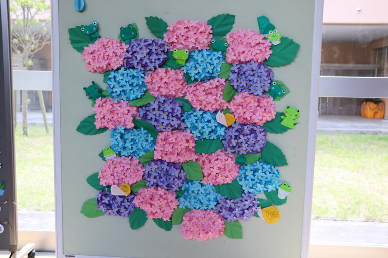 例年だと梅雨入りしている6月、昇降口には色とりどりのアジサイの花が満開に咲いていました。