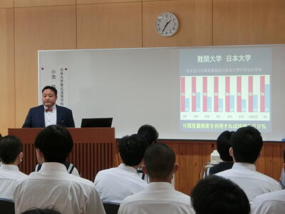 本日、7月4日(木)5・6校時に3学年生徒及び希望する保護者の皆様を対象に高等学校説明会が実施されました。学習室、会議室、多目的ホールの3会場に分かれて行われました。