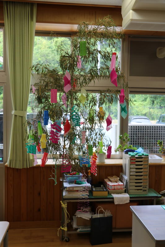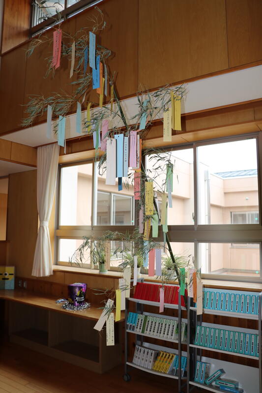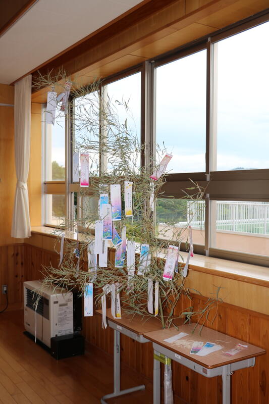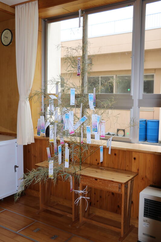本校でも、各学年で学年ホールや教室内に笹を準備し、生徒や先生が思い思いの願い事を短冊に書いて、飾り付けしました。