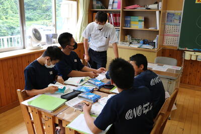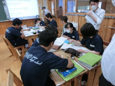 最後には互いに発表し合うため、本時の授業では、各自が書いた日本語の下書きを英語に翻訳して、その英語がより伝わりやすくなるようにグループ内でアドバイスし合いました。