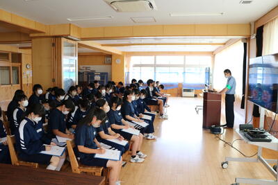 2年生の時には、保健の授業で、教科書を使って学習していますが、今回は、田村警察署小野分庁舎の職員をお招きし、ご講話いただきました。