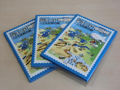 中学校でいただきましたのは、図書購入費10万円と世界地図帳「ジュニア地図帳 こども世界の旅」3冊です。