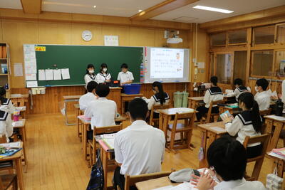 今朝はその初日ということで、生徒会の保健委員会の生徒が、各学級を回り、スライドを用いて朝食摂取と生活リズムに関する内容の説明をしました。(本日できなかった学級は明日行います。)