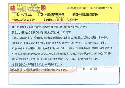 本週間中は、朝の学習の時間に、朝食の内容について主食、主菜、副菜、汁物の何を食べたかを、「自分手帳」に記録します。そして、14日(金)に振り返りを行う予定です。