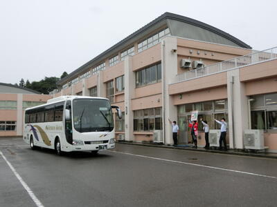 雨が降る中ですが、選手たちは無事学校を出発しました。