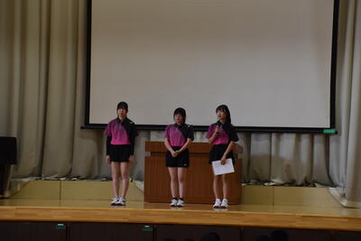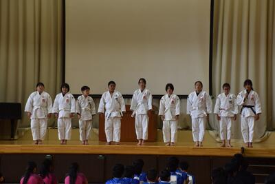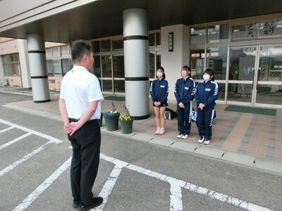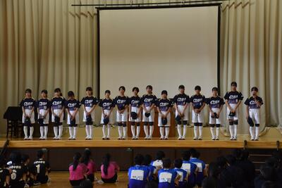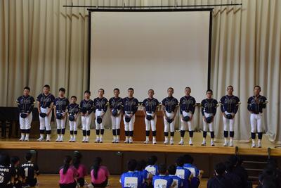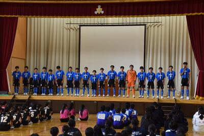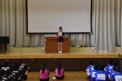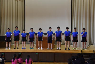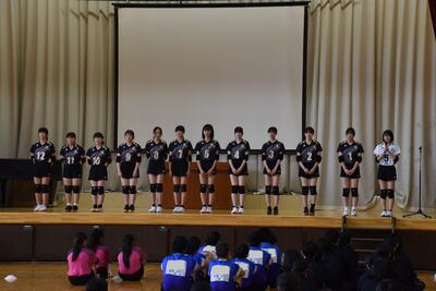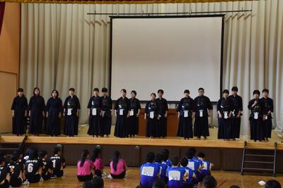 最後に、選手を代表して、この中体連をもって休部となるソフトテニス部の部長が「今まで『勇往邁進』という言葉を胸に頑張ってきました。一生懸命練習してきた自分や仲間も信じて頑張ります」と決意表明し、激励会を締めくくりました。