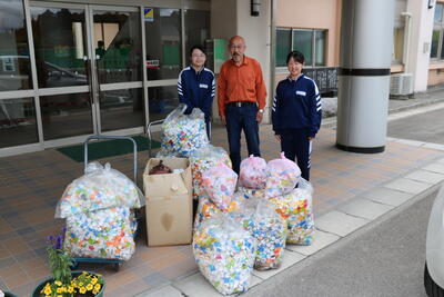 本日、本校OBの地域の方が、活動に賛同し、ご家庭で集めていたたくさんのエコキャップを寄付していただきました。