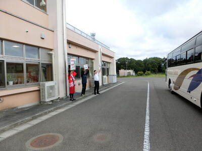 本日大会2日目、夕陽ヶ丘テニスコートで個人戦を行うソフトテニス部の生徒も、笑顔でバスに乗り込み、学校を出発しました。