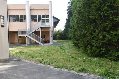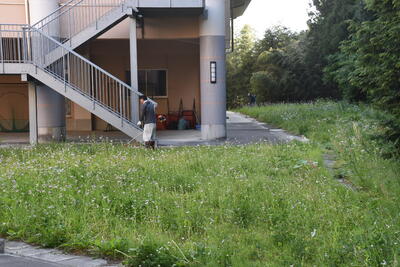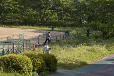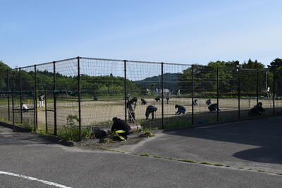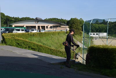 草刈り機を使って校庭や校舎、体育館、ふれあいの坂周辺の除草をしていただいたり、手作業でテニスコート内の除草をしていただいたり、1時間程度作業をしていただきました。