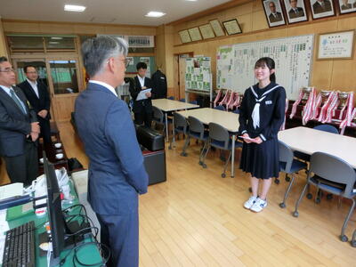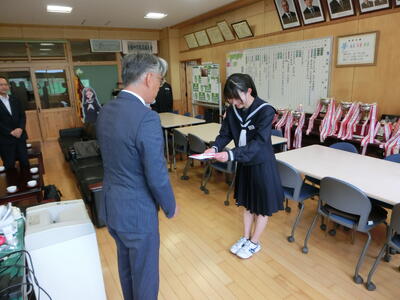 クラブの代表の方から「デジタルで情報が手に入る中、新聞を読んで、そのよさを感じてほしい」とお話をいただき、本校を代表して生徒会長に目録が授与されました。
