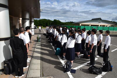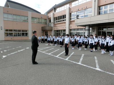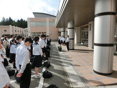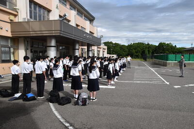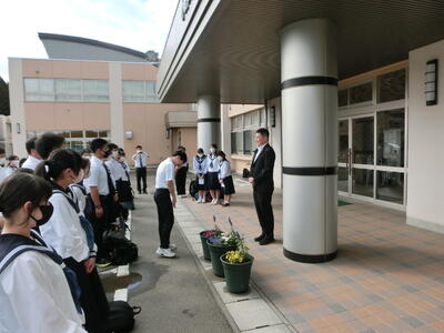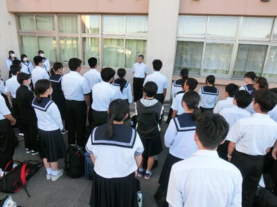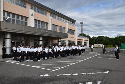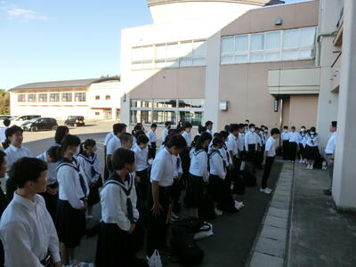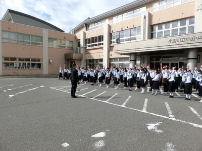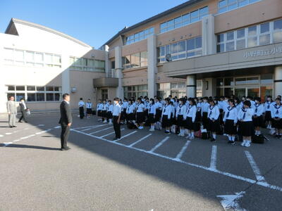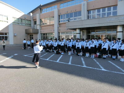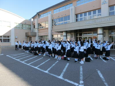 1年生は登校してきた3年生にも見送られ、予定どおり学校を出発しました。