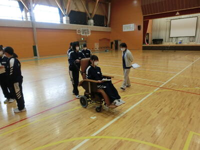 その後、グループに分かれて介護体験を実施しました。介護体験は、介護する側だけでなく、介護される側も疑似体験することができました。お年寄りの方の不自由さを体験することができました。
