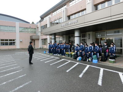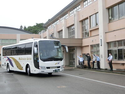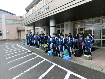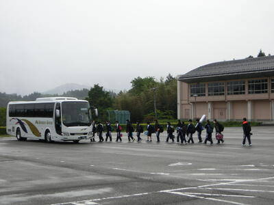 昨晩からの雨もほぼ止みましたが、少し肌寒さを感じる中、参加生徒はみんな元気に学校を出発しました。
