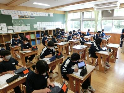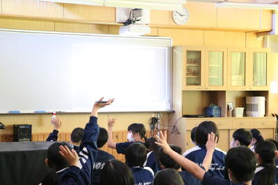 これまで、タブレットを使って調べ学習は行ってきましたが、今回は学校の音楽室にいながら、「アクアマリンふくしま」のスタッフの方と事前のオリエンテーションを行いました。