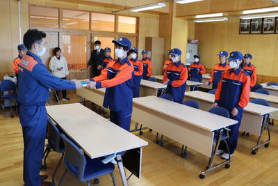 まず初めに消防クラブ団員全員が呼名された後、田村消防署小野分庁舎の職員の方から代表の副団長に、「団員証」が授与されました。