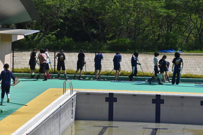本日5月22日(水)、快晴の中、プール清掃が始まりました。