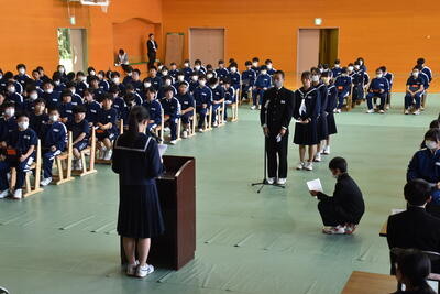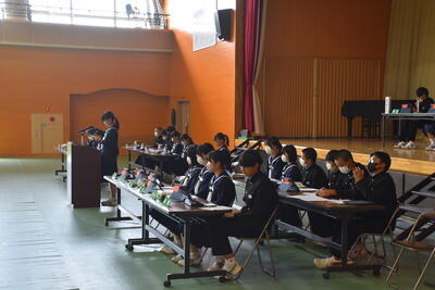 4月に生徒会委員会や部活動編成会を行い、生徒会執行部を中心に総会要項の作成、各学級での議案書審議、質問・要望等に対する答弁の検討、リハーサルを経て、今日のこの総会を迎えました。