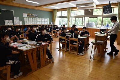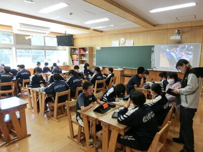 ただ、防災教育担当の教師がスライドを使って、災害時の対応や、校内における消火器やAEDの設置場所の確認などについて、生徒自ら考えながら振り返りを行いました。