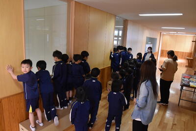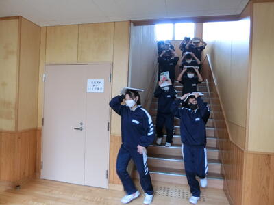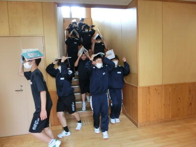 子どもたちは真剣な表情で、頭をファイル等で守りながら、雨天時の避難先である体育館に避難しました。