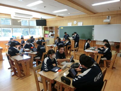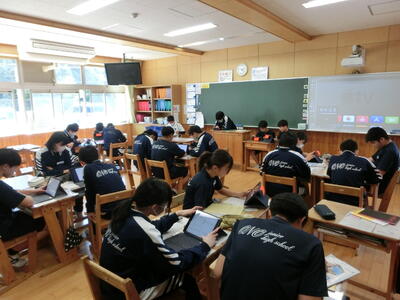 他にも、グループで数学の計算問題を教え合ったり、ペアで学習した英語を使って会話をしたり、タブレットを使ってスライド作りに取り組んだり、理科で水素を発生させ、燃焼させる実験を行ったりなどなど、どの授業も笑顔が見られ、楽しく学習できています。