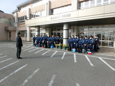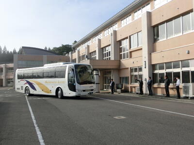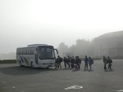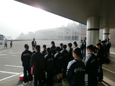 まだ霧が残る6時30分頃、参加生徒37名が元気に学校を出発しました。