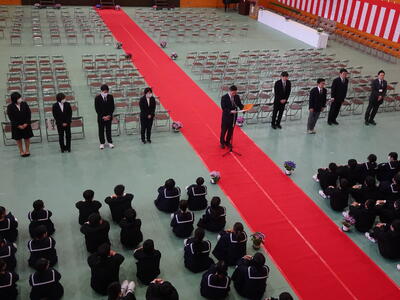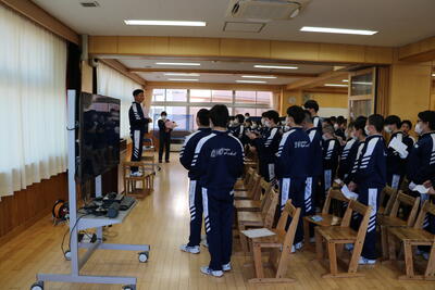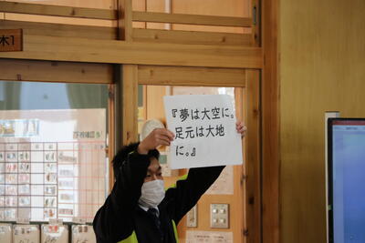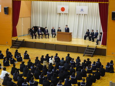 最初に、学年委員長を務める生徒と学年主任からお話があり、学年主任からは『夢は大空に、足元は大地に。」などのメッセージが送られました。