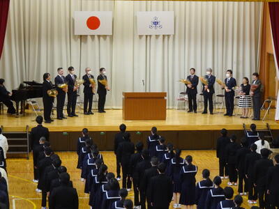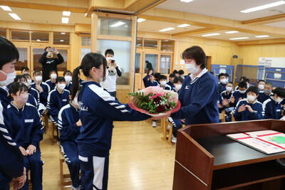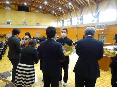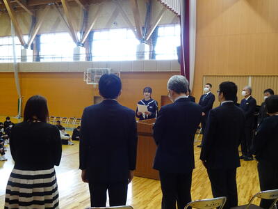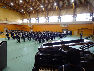 先生方と関係の深い代表生徒からそれぞれに花束の贈呈があり、最後に転出される音楽科の先生の伴奏により、体育館中に響く校歌で全校生で感謝の気持ちを伝えました。