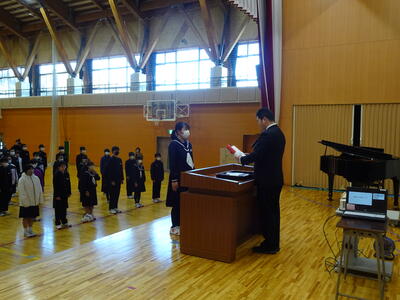 本日配付された通知表をもう一度1学期から読み返していただき、4月からの「今までの自分」、そして一年間頑張った「今の自分」、そして新しい学年に向かう「これからの自分」について、春休みを利用してご家庭でも考えてほしいと思います。