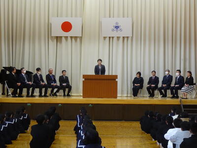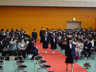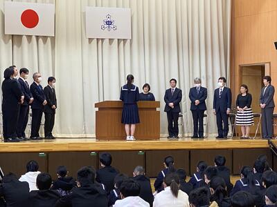 在校生を代表して、生徒会長から「『挑戦、努力、継続』この3つのことは中学校生活だけでなく、人生においても大切なことです。困難なことにも果敢に挑戦し、青春の1ページを共に描いていきましょう。」と歓迎のことばがありました。