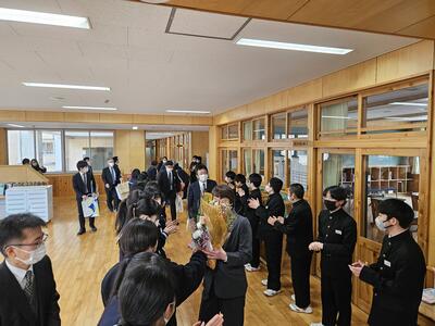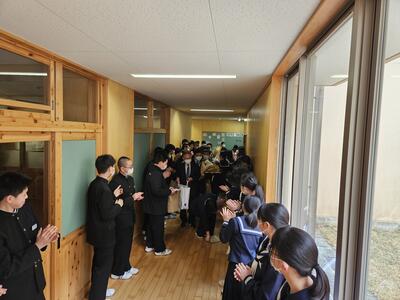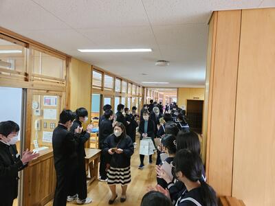 校舎内でのお見送りでは、在校生や卒業生以外にも、過年度の卒業式や保護者の方々もたくさんお別れに来てくれました。