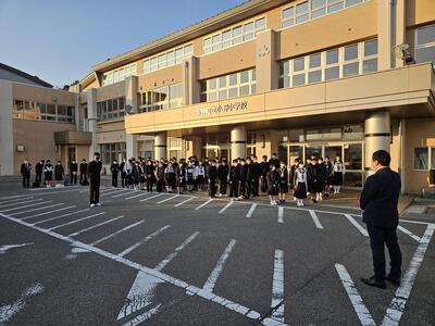 小野町の朝は、さすがに肌寒かったですが、元気と笑顔いっぱいに出発式を行い、5時55分に中学校を出発しました。