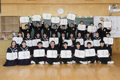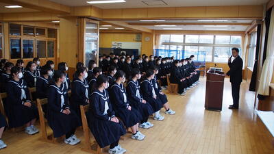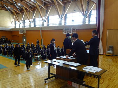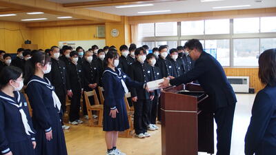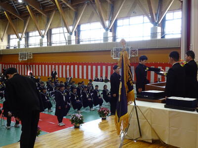 本日は、同窓会会長さんにもお越しいただき、ご挨拶をいただき、「仲間との友情を大切に、中学校で学んだことをこれからも生かしてほしい」とのお話がありました。また、記念品もいただきました。