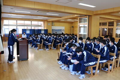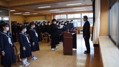 最後に、令和5年度入会生代表の生徒から「中学校生活で育んだ絆は途切れることはないと信じ、小野中学校の卒業生としての誇りを胸に日々生活してきます」との誓いの言葉で会を締めくくりました。