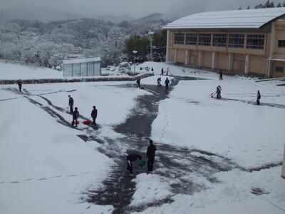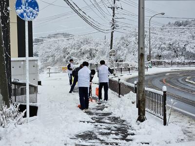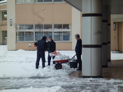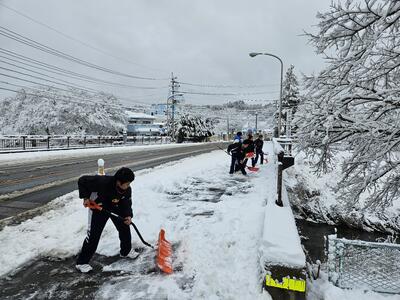そんな中、本校では、早く登校した1、2年生が、昇降口前駐車場やふれあいの坂、歩道などの除雪作業を行いました。