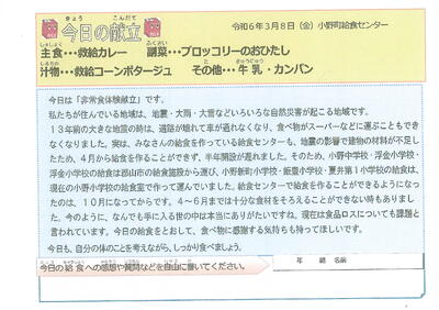 13年前、小野町の給食センターも、地震の影響で建物の材料が不足したため、給食を作ることができず、他の給食施設の協力を得て給食を提供していたそうです。