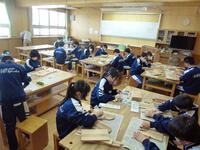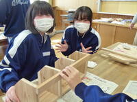 本校では、毎年、森林環境学習として、第1学年の技術科で間伐材について学習し、実際に間伐材を教材として木材加工を行っています。自分のイメージした製品が形になるようけがきから切断、面取りなど各自熱心に取り組んでいます。