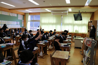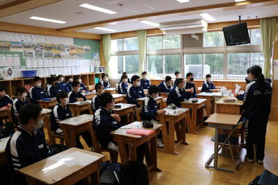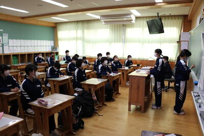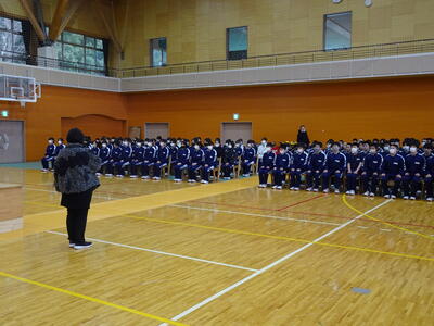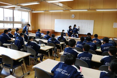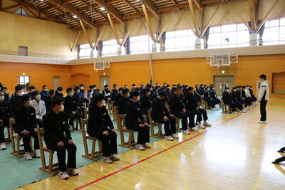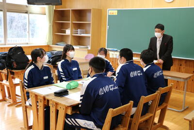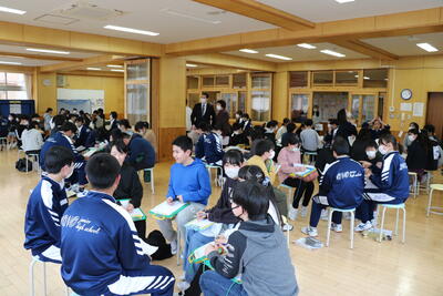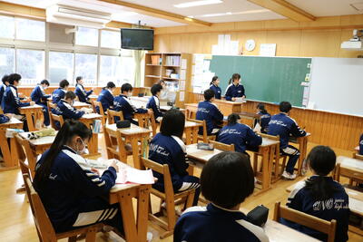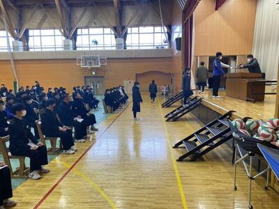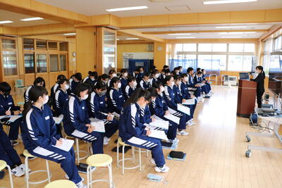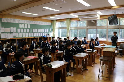 1、2年生は普段どおりの各教科の授業を、3年生は学年集会で、「卒業を前に」と題し、3年間の学校生活の様子を振り返る発表が行われました。