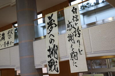 ちなみに、昇降口には、本校に以前勤務されていた先生に書いていただいた作品(「夢への挑戦」「自信と誇りと感謝を胸に」)が飾られています。