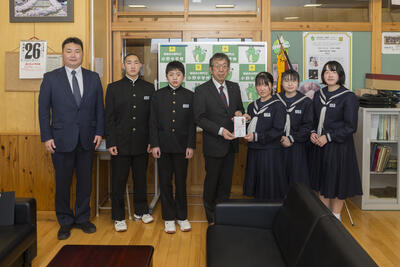 そして本日、ボランティア委員会の委員長さんたち5名が、小野町社会福祉協議会の職員の方に集まった義援金を手渡ししました。