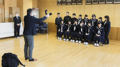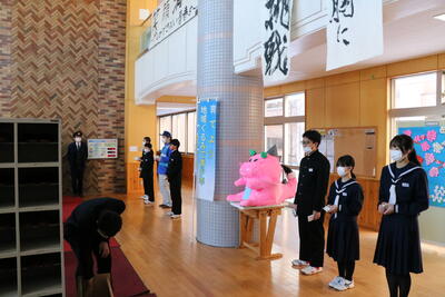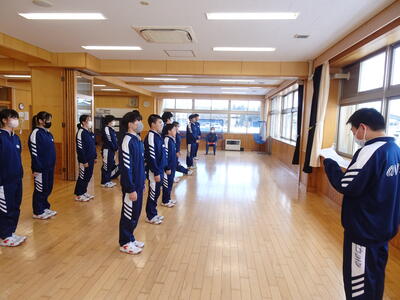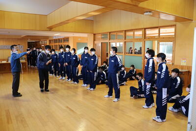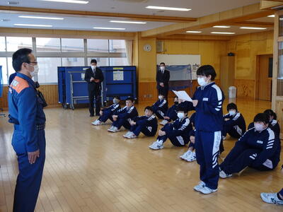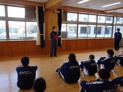 昨日2月7日(水)の昼休みに、多目的ホールにて、「小野中学校少年消防クラブ」の退団式が行われました。