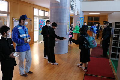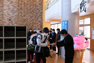 2月7日(水)の登校時間に合わせて昇降口前で、田村警察署小野分庁舎の警察官と田村地方少年警察ボランティアの少年補導員の方と一緒に、本校の生徒会役員が挨拶運動を行いました。